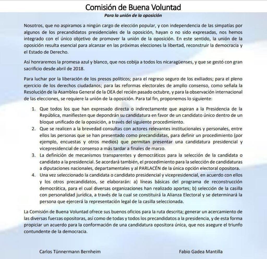 “La Comisión de Buena Voluntad ofrece sus buenos oficios para la ruta descrita; generar un acercamiento de las diversas fuerzas opositores, así como de todas y todos los precandidatos a la presidencia, y de esta forma propiciar un acuerdo para la conformación de una candidatura opositora única, que nos asegure el triunfo contundente de la democracia”.