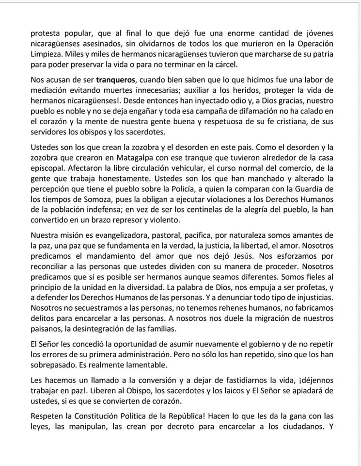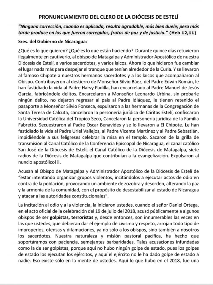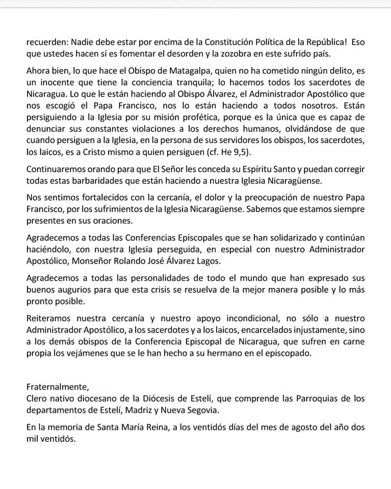 “Liberen al obispo, a los sacerdotes y laicos y el Señor se apiadará de ustedes si es que se convierten de corazón. Respeten la Constitución Política. Hacen lo que les da la gana con las leyes, las manipulan, las crean por decreto para encarcelar a los ciudadanos y recuerden: nadie debe estar por encima de la Constitución, eso que ustedes hacen sí es fomentar el desorden y la zozobra en este sufrido país”, se lee en el contundente comunicado del clero de la Diócesis de Estelí.