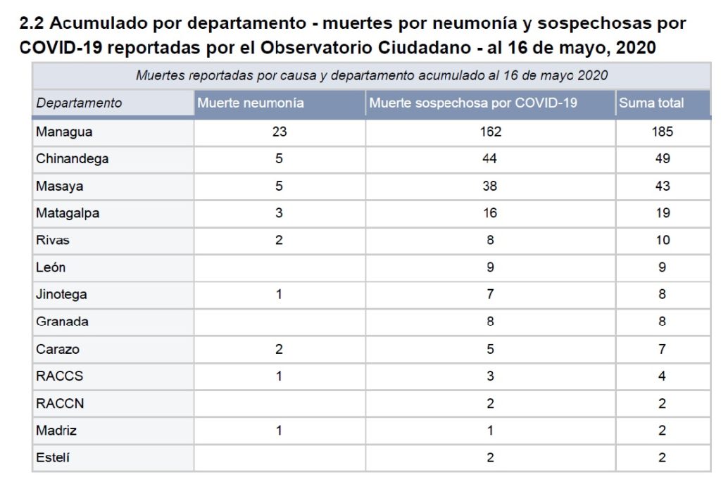 El Ministerio de Salud, ha evitado dar a conocer a que zonas del país corresponden los casos del nuevo coronavirus en sus cifras oficiales reportadas, con 279 positivos y 17 personas fallecidas; sin embargo, el acumulado del Observatorio Ciudadano Covid-19 Nicaragua, coloca a Matagalpa como el cuarto departamento por mayor incidencia de contagio, con 111 casos positivos hasta el 16 de mayo.