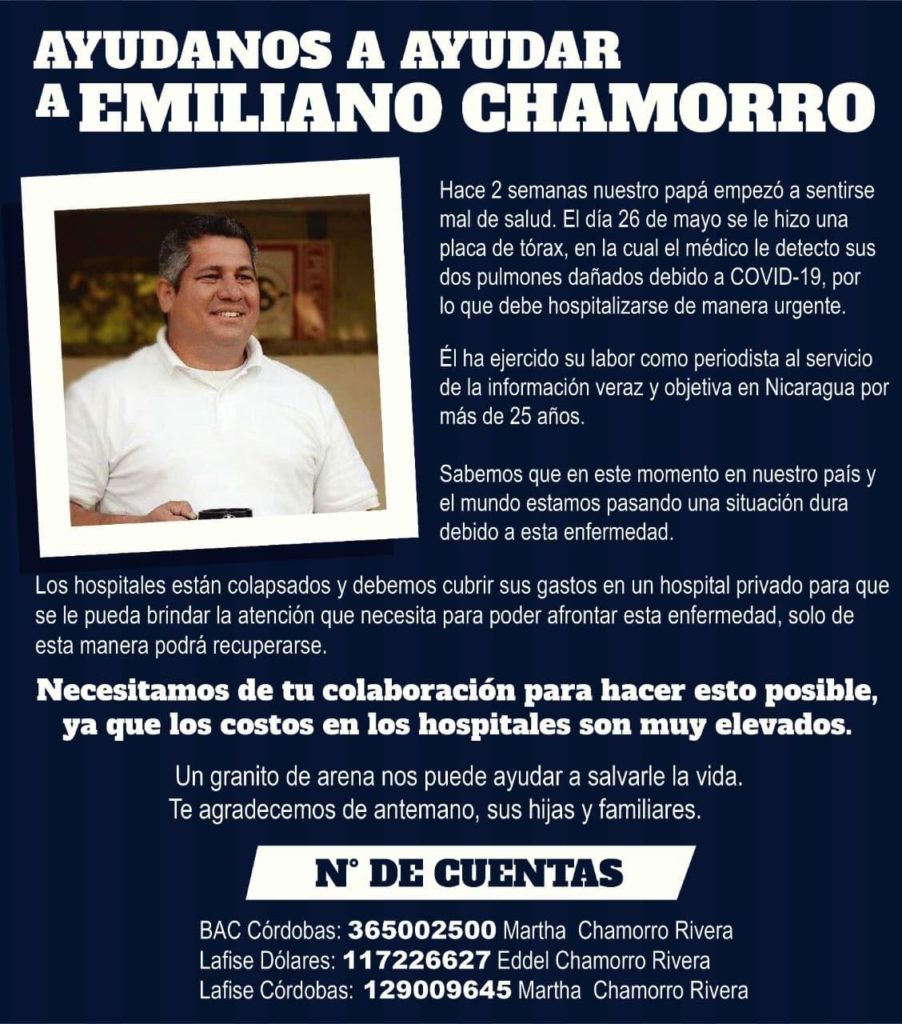 Unos de los periodistas enfermo por el COVID19, es Emiliano Chamorro Mendieta, quien según su familia presenta serias complicaciones en sus pulmones debido al virus y necesita ser hospitalizado de forma urgente.