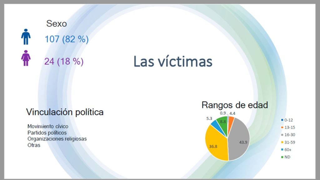 “Entre enero y junio de 2020, se identificaron 114 casos de asesinatos en diferentes lugares de Nicaragua, con un total de 131 víctimas, de las cuales 107 eran hombres (82 %) y 24 eran mujeres (18 %). Comparando esta información con el mismo período del 2019, hay una diferencia pues la mitad de los casos ocurrieron en las zonas rurales (50.9 %) y la otra mitad en localidades urbanas (48.2 %)”.