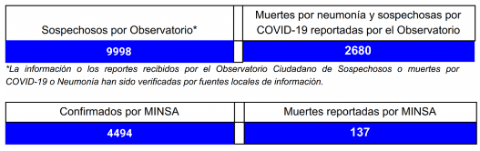Al 26 de agosto el Observatorio Ciudadano reporta un acumulado de 9.998 casos sospechosos y 2,680 muertes verificadas.