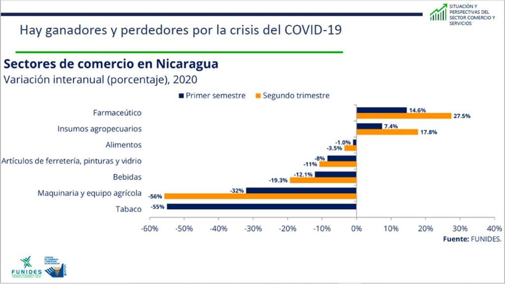 Por su parte, la Cámara de Comercio y Servicios de Nicaragua (CCSN) en conjunto con la Fundación Nicaragüense para el Desarrollo Económico y Social (Funides) presentaron en su reciente informe “Situación y Perspectiva del Sector Comercio y Servicios” los efectos negativos de la pandemia y las acciones del Estado en el sector comercio de Nicaragua.