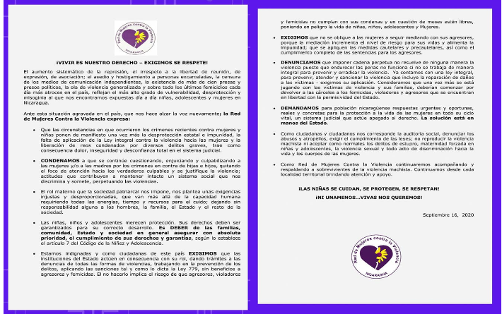 El movimiento exige al Estado de Nicaragua velar por la vida y protección de las mujeres, niñas, niños y adolescentes.