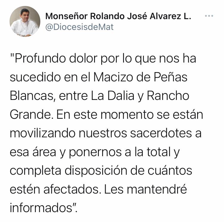 El obispo de Matagalpa, monseñor Rolando Álvarez, escribió en las redes sociales: “Profundo dolor por lo que nos ha sucedido en el Macizo de Peñas Blancas, entre La Dalia y Rancho Grande. En este momento se están movilizando nuestros sacerdotes a esa área y ponernos a la total y completa disposición de cuántos estén afectados. Les mantendré informados”.