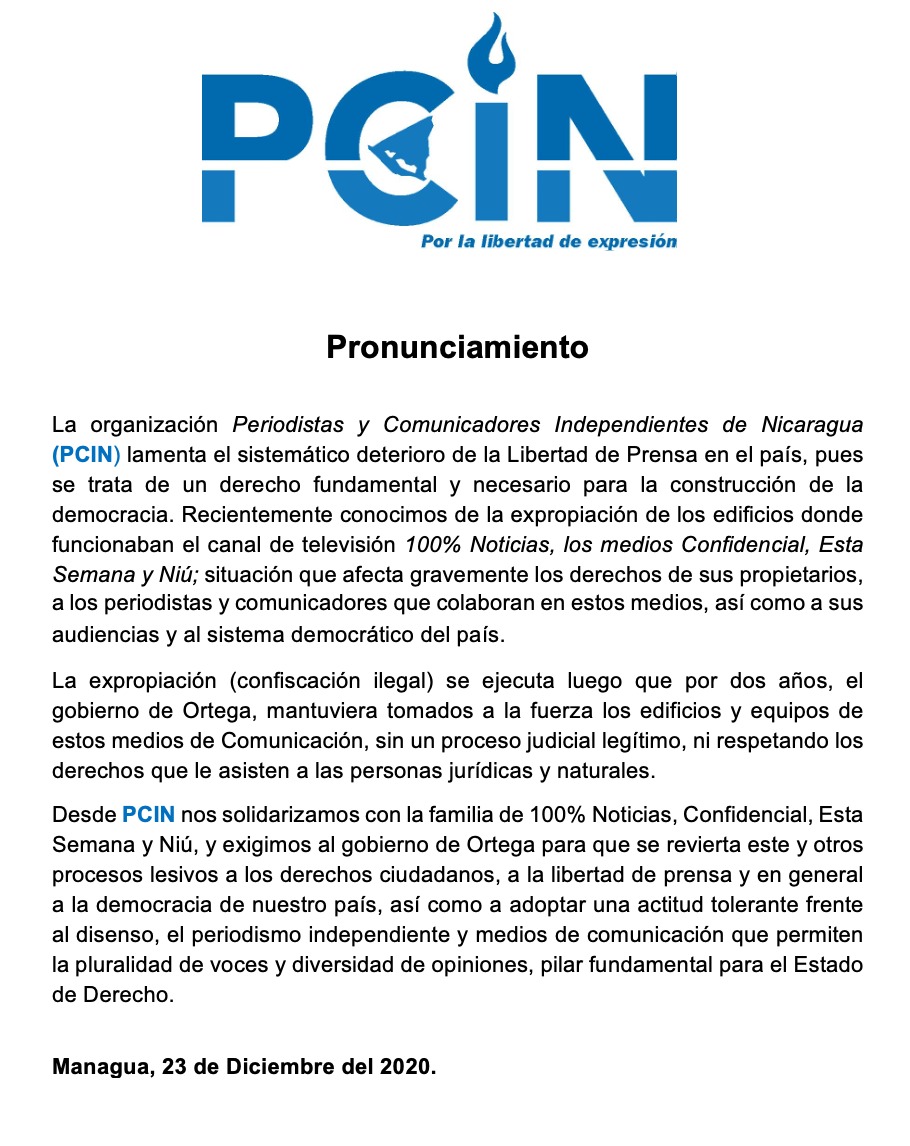 “La expropiación (confiscación ilegal) se ejecuta luego que por dos años, el gobierno de Ortega, mantuviera tomados a la fuerza los edificios y equipos de estos medios de Comunicación, sin un proceso judicial legítimo, ni respetando los derechos que le asisten a las personas jurídicas y naturales. Desde PCIN nos solidarizamos con la familia de 100% Noticias, Confidencial, Esta Semana y Niú, y exigimos al gobierno de Ortega para que se revierta este y otros procesos lesivos a los derechos ciudadanos, a la libertad de prensa y en general a la democracia de nuestro país”.