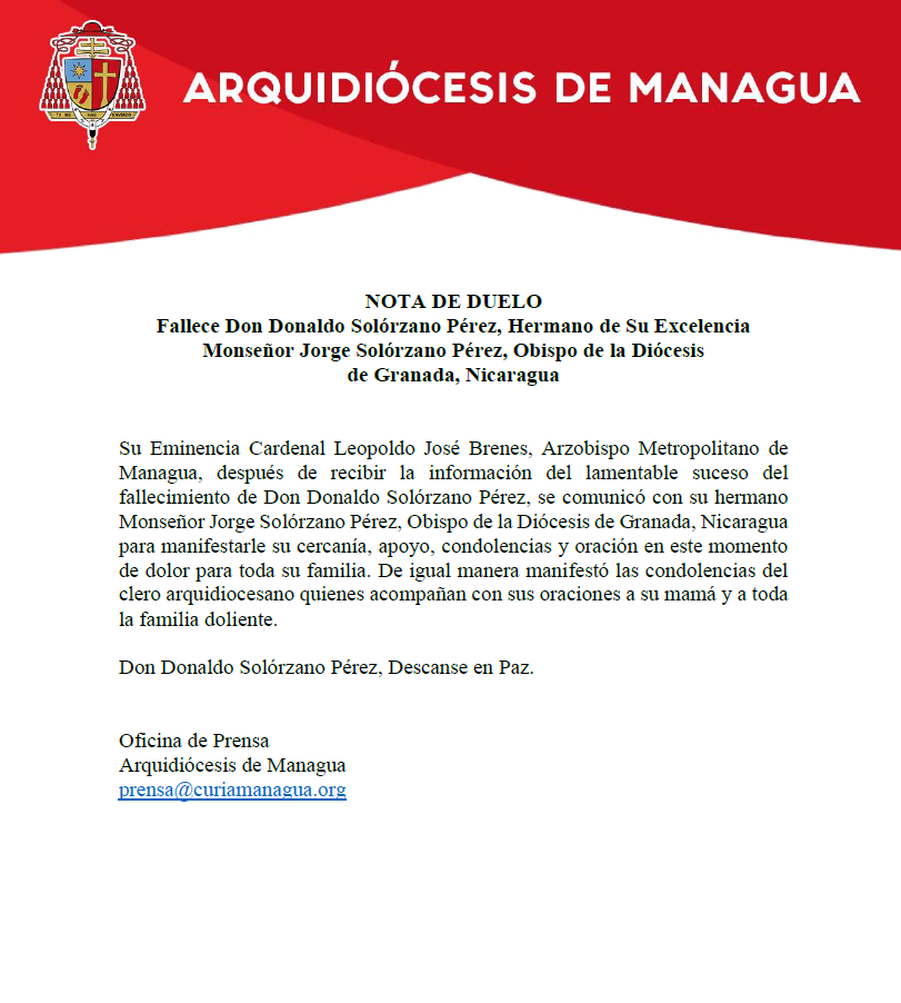 “Al tiempo que, los Señores Obispos extienden su pésame amoroso y su cercanía en este momento de dolor a Su Exc. Rev. Mons. Jorge Solórzano Pérez, Obispo de la Diócesis de Granada. Y ruegan a nuestro buen Dios plegarias por el eterno descanso del alma de su hermano Donaldo”.
