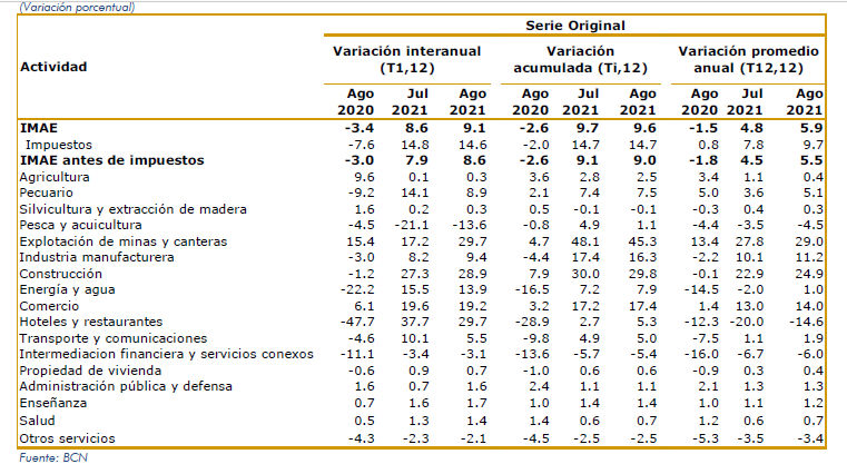 El Banco Central de Nicaragua actualizó las cifras sobre el comportamiento de la economía hasta el mes de agosto de 2021. Según el Índice Mensual de Actividades Económicas (IMAE) Nicaragua registró crecimientos de 0.4 por ciento respecto a julio y de 9.7 por ciento con relación a agosto de 2020.