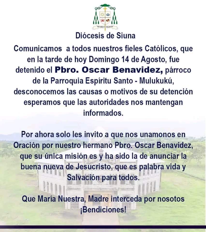 “Comunicamos a todos nuestros fieles católicos que en la tarde de hoy domingo 14 de agosto fue detenido el presbítero Oscar Benavidez párroco de la parroquia Espíritu Santo Mulukukú, desconocemos las causas o motivos de su detención, esperamos que las autoridades nos mantengan informados”, señala el comunicado.