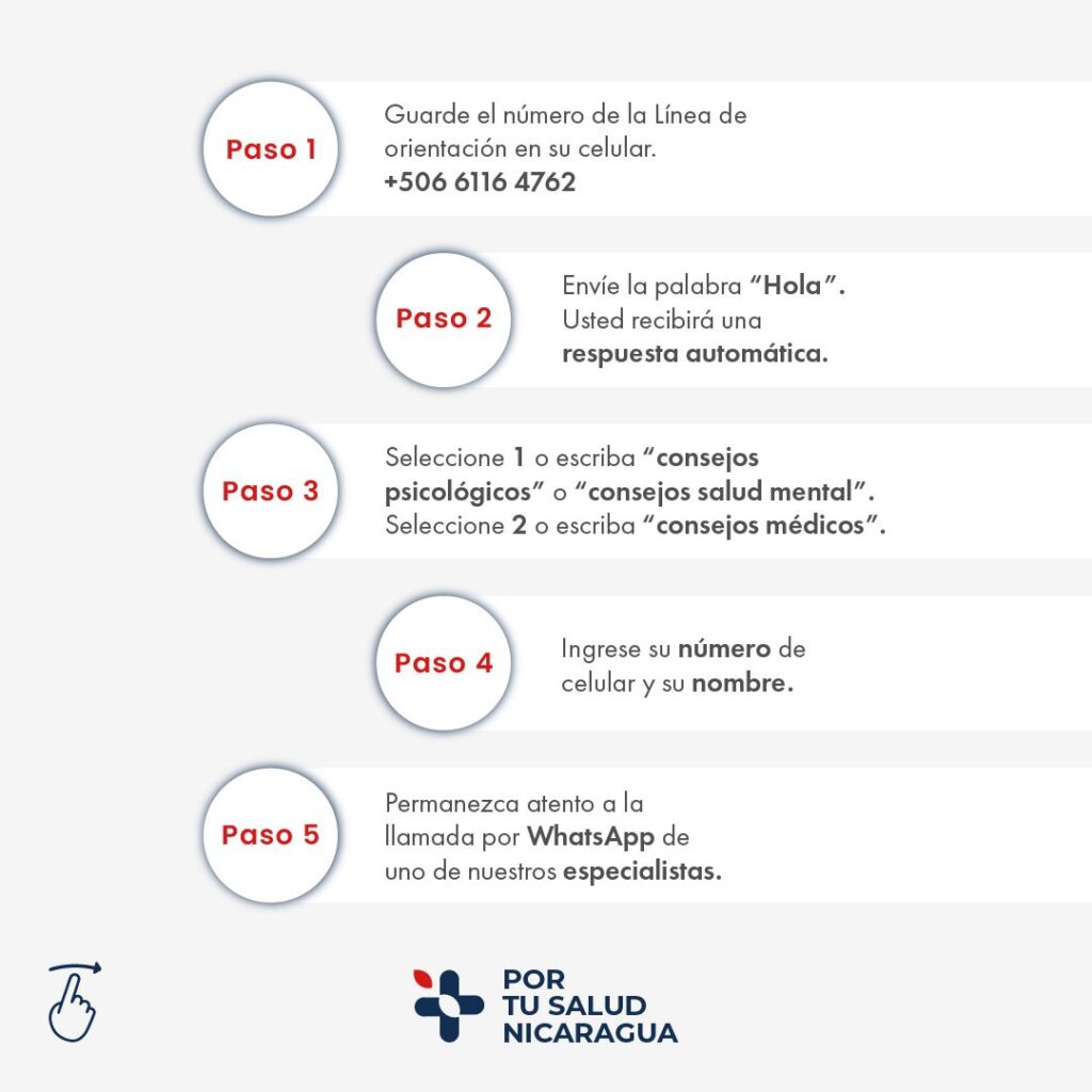 Los nicaragüenses residiendo en Costa Rica podrán acceder a la línea de consejería en salud guardando el número +506 6116 4762 y luego escribiendo “Hola” a través de WhatsApp para agendar una sesión de consejería en temas psicológicos o de salud.