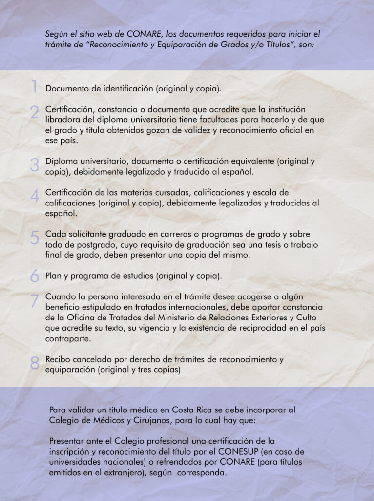 Según el sitio web de CONARE, los documentos requeridos para iniciar el trámite de “Reconocimiento y Equiparación de Grados y/0 Títulos”, son: