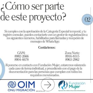 Para acceder al acompañamiento en la Categoría Especial, Fundación Mujer asegura que tiene a gestoras de regularización migratoria en la zona norte del país y en el Gran Area Metropolitana.