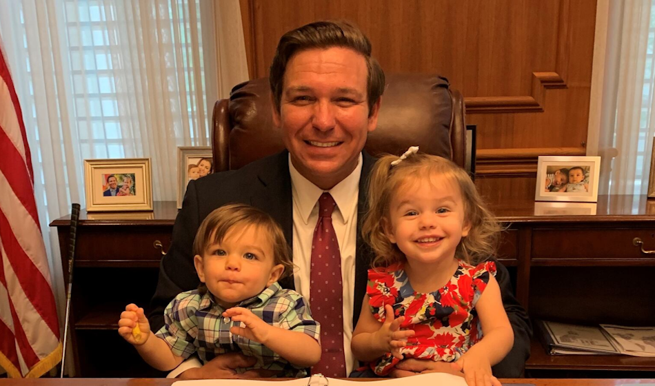 Ron DeSantis, gobernador republicano de la Florida que busca relajar las prohibiciones al trabajo infantil, junto a sus hijos en 2019.