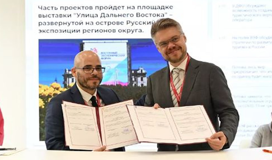 Daniel Edmundo Ortega Murillo, hijo de la pareja presidencial, presta su firma para un acuerdo de cooperación con el medio estatal ruso Sputnik en Vladivostok, Rusia, en el marco del VII Foro Económico Oriental. A su lado, Vasili Pushkov, el jefe de la cooperación internacional de Sputnik. 5 de septiembre, 2022.