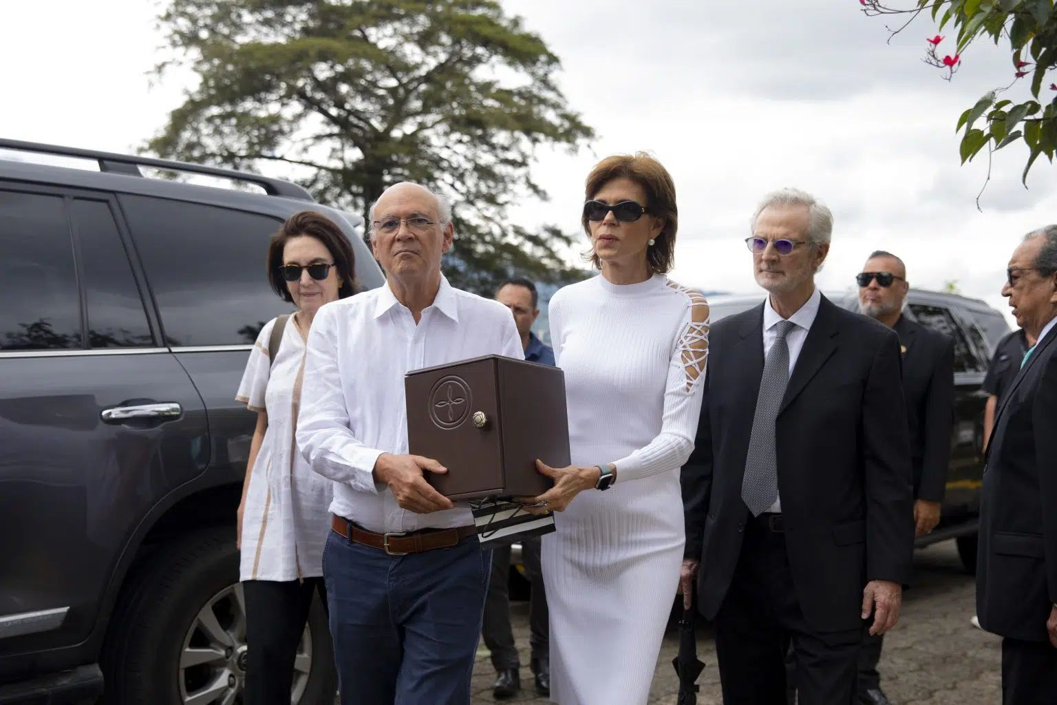 Carlos Fernando y Cristiana, ambos Chamorro Barrios, cargan juntos la urna cineraria con los restos de su madre, Violeta Barrios de Chamorro, rumbo a inhumarla en el Cementerio General de San José, Costa Rica. Foto: República 18