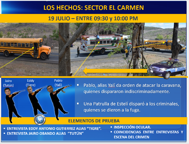 En su presentación incluyó videos en los que los supuestos responsables admitían haber participado en la masacre. Videos que cuestionaron los familiares de los detenidos, aduciendo que estos habían sido torturados y amenazados para “aprenderse un guion” y admitir la responsabilidad.